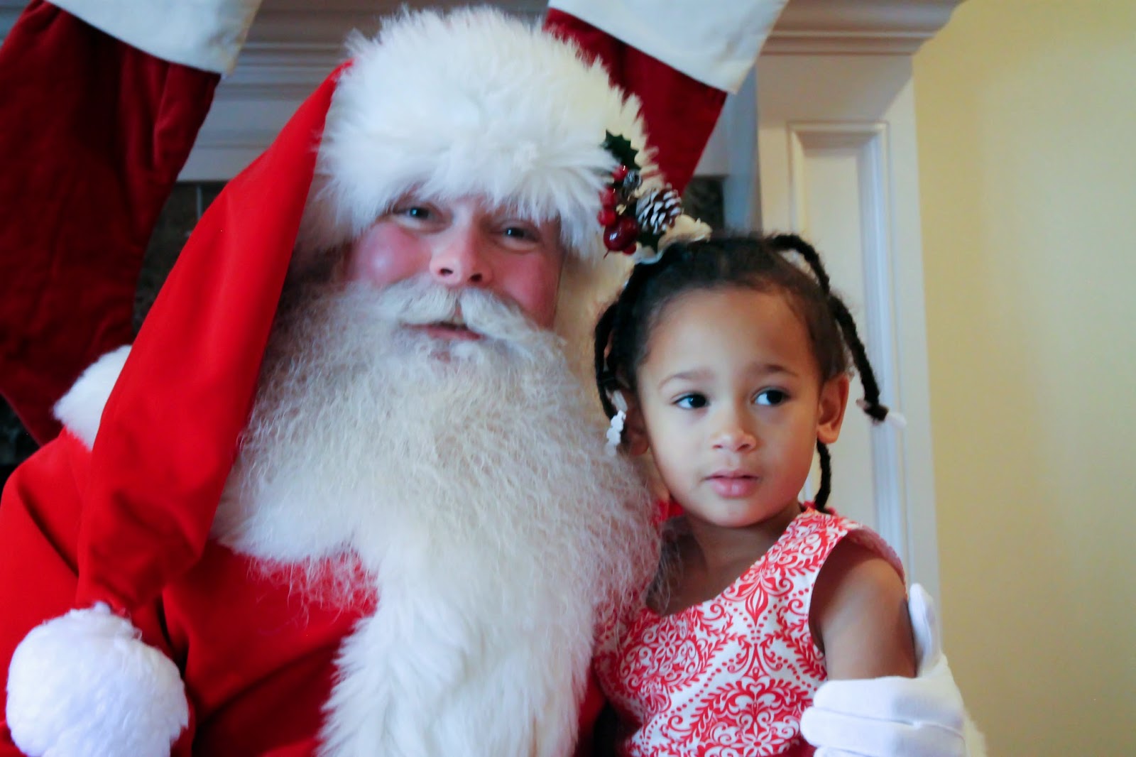 Ava loved Santa this year. The entire week leading up to the Christmas Party she was talking about him coming to her house. She was a little shy at first but then started talking to him and gave him a big hug. She didn't specify what she wanted from Santa, she just said she was good this year and that she wanted presents.